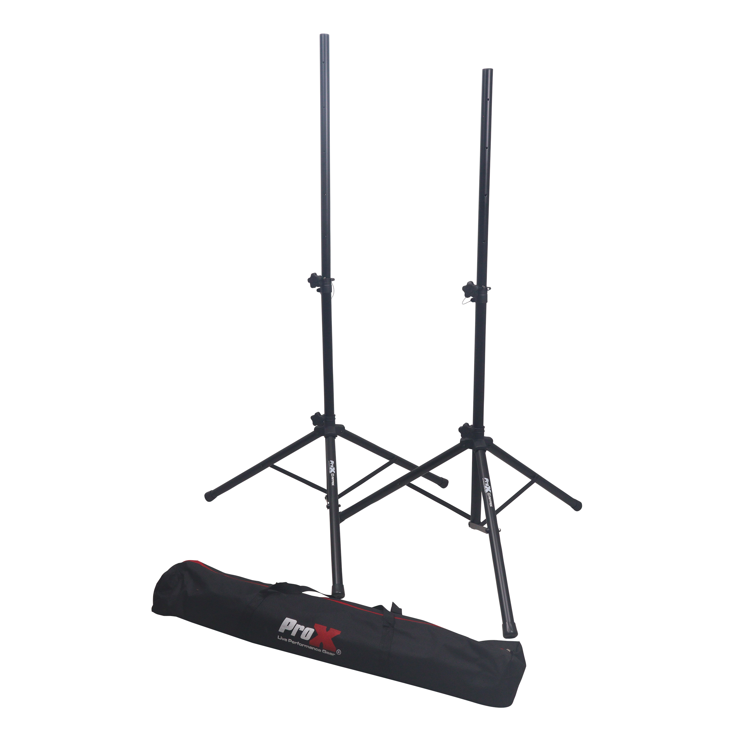 Supporting the speakers are ProX T-SS18P heavy-duty tripod stands, constructed from steel and aluminum with all-metal joints and a secure locking pin mechanism. These stands provide reliable elevation, fast setup, and stable support for professional PA use.