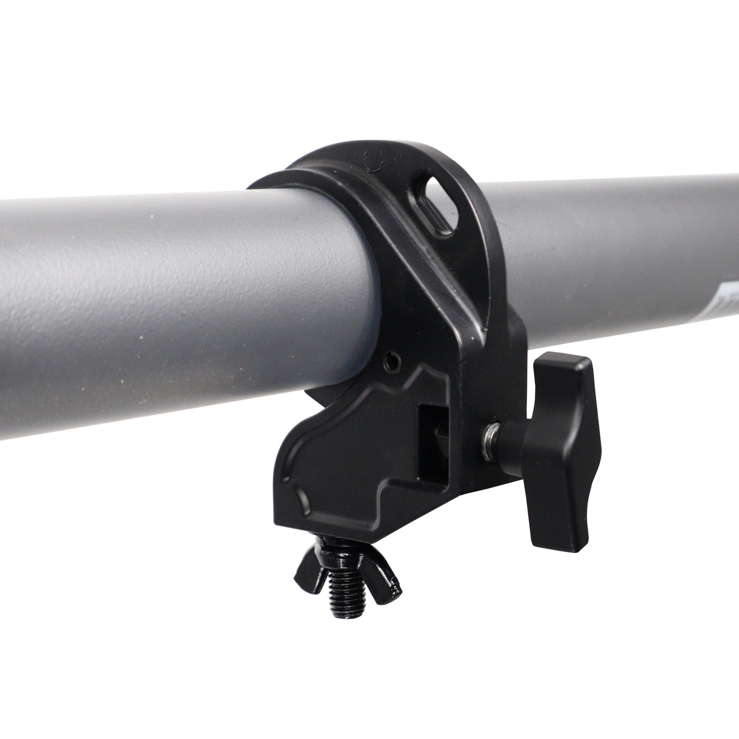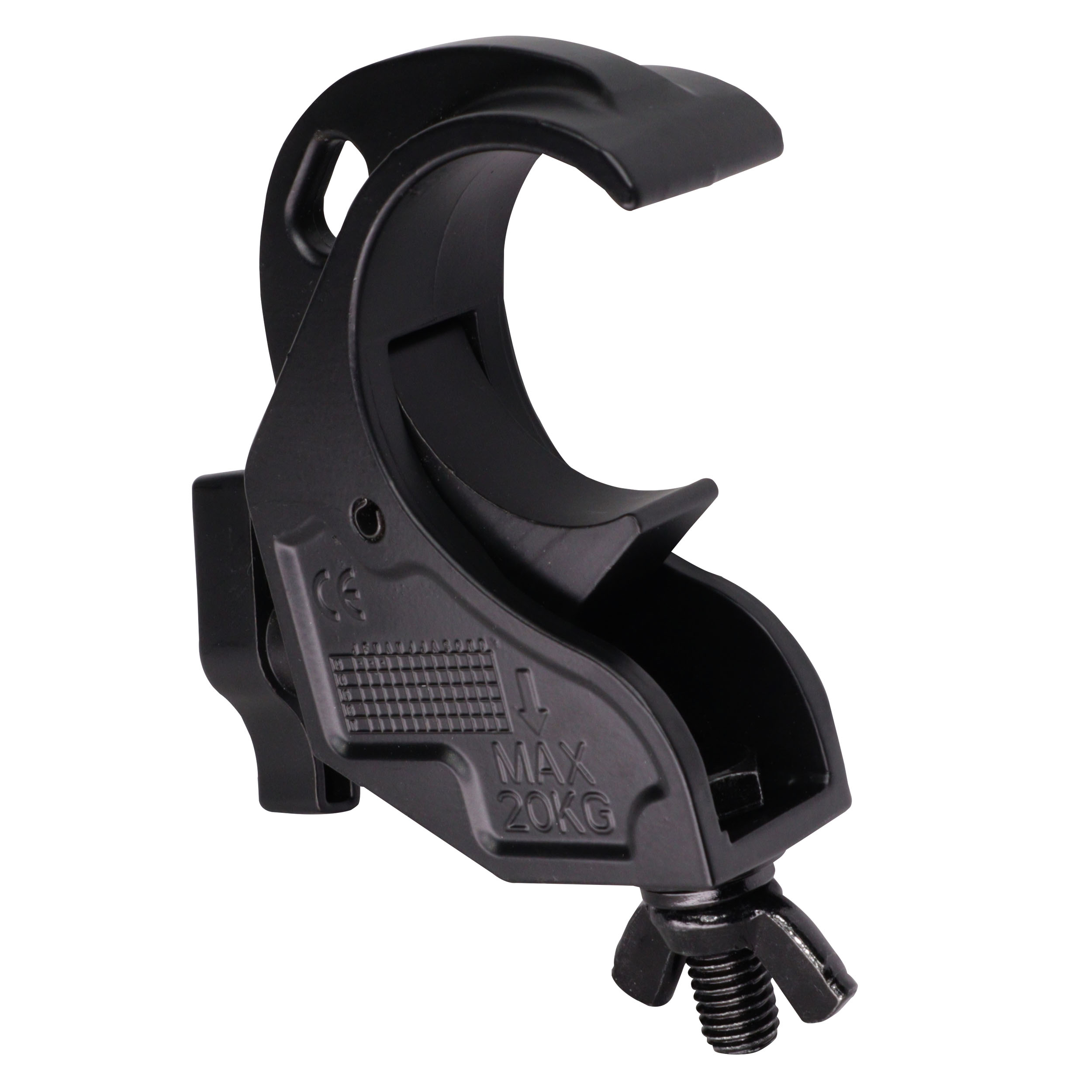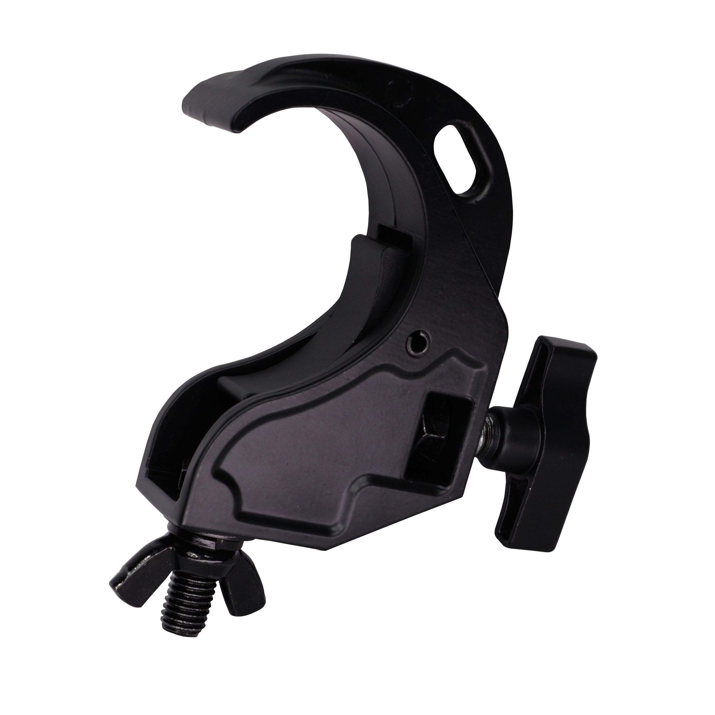 Featuring a hook/trigger-style design, the clamp supports the fixture’s weight during installation, allowing for easier and safer mounting on truss systems. The included large wing knob allows quick hand tightening without requiring additional tools, making setup and teardown faster during live events or installations.