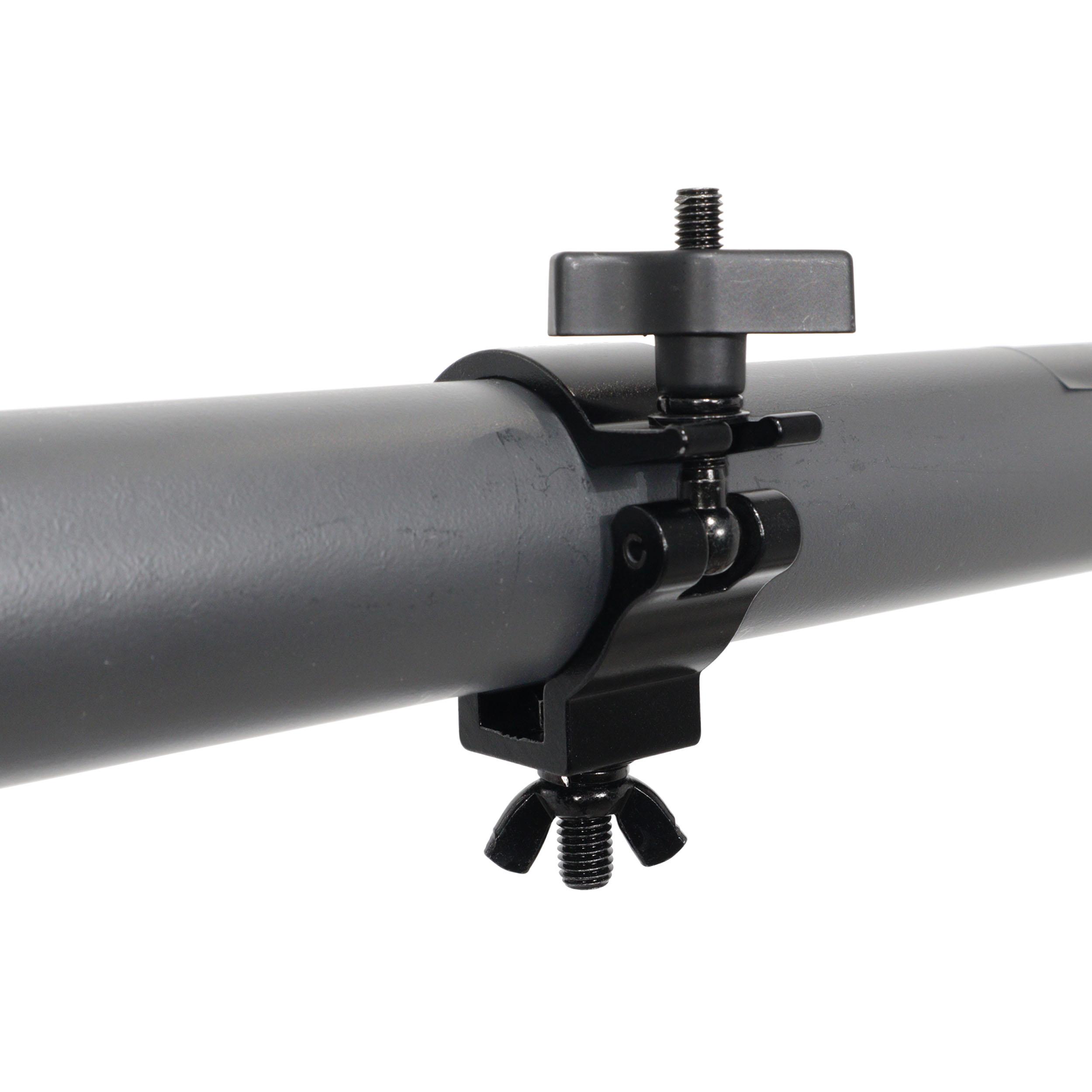 The large wing knob allows for fast, tool-free installation and removal, making setup and teardown efficient in demanding production environments. An integrated M10 threaded bolt attachment adds versatility, allowing compatibility with a wide range of lighting fixtures and rigging accessories.