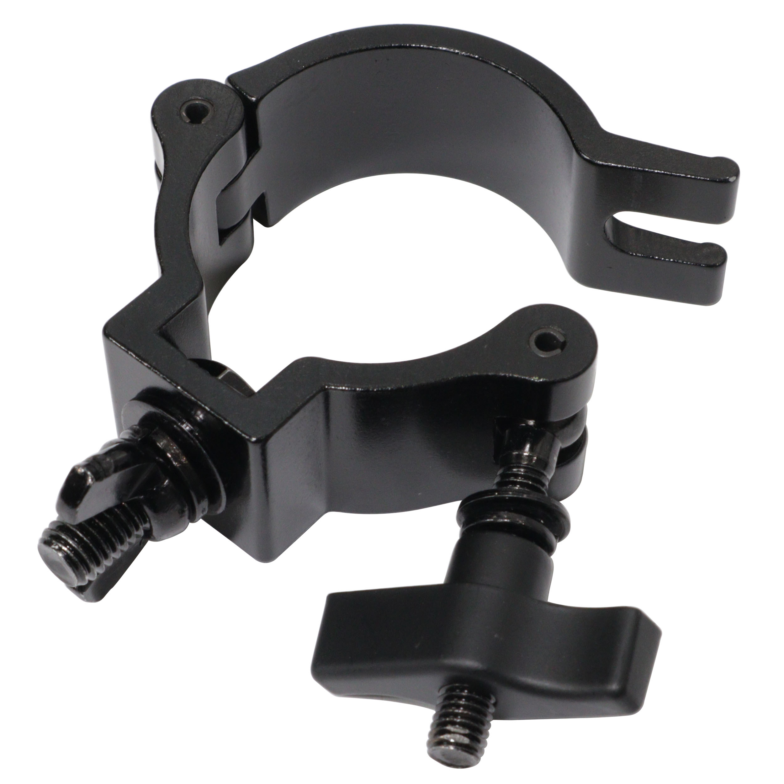 The ProX T-C9H-BLK Aluminum Slim M10 O-Clamp with Big Wing Knob is a professional truss-mounting solution designed for securely suspending lighting fixtures and production equipment from standard 2-inch truss systems. Finished in a durable black powder coat, this clamp blends strength, reliability, and a clean professional appearance for live events, touring rigs, and permanent installations.