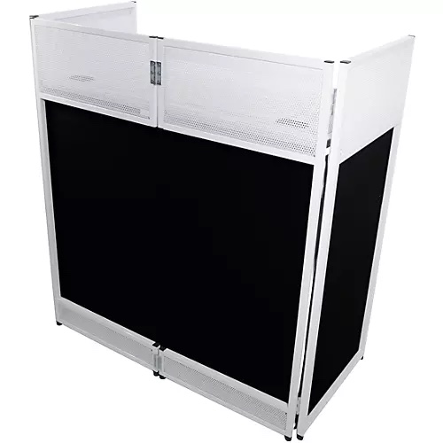 The ProX XF-VISTA WH Vista DJ Booth and Workstation give you an elegant professional look. With its strong and lightweight 3 sided folding aluminum frame with a White finish. This media added DJ booth Is all you need for an exceptional DJ station. The setup of the system is easy and takes less than 5 minutes. Two cable pass-throughs on the tabletop. The XF-VISTA w/ White & Black scrim kit with velcro style hook and loop closure, It comes with 3x black and 3x white scrims. It comes with two separate carrying bags for the scrims and a padded carry bag for the folding workstation itself. The work table is designed to hold up to 100 lbs evenly distributed and has a ventilated design to keep your equipment cool.