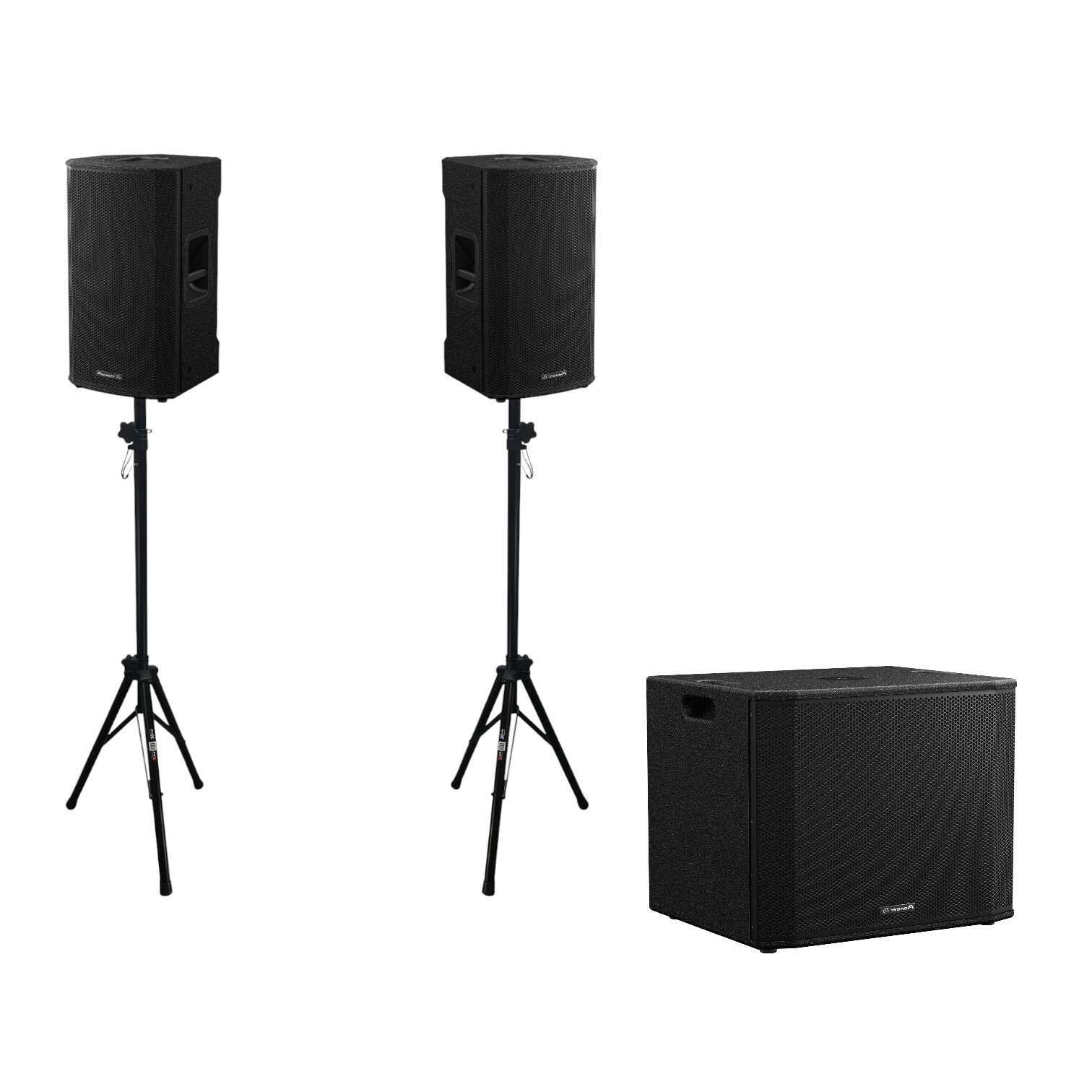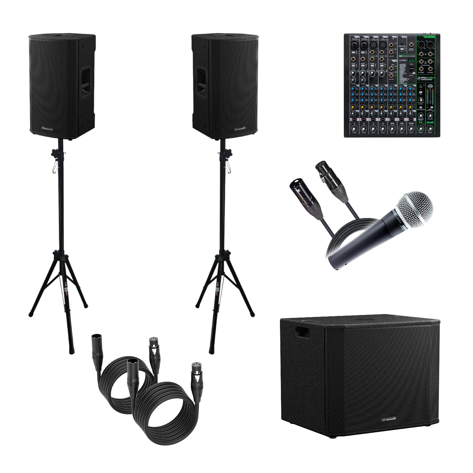 Mackie ProFX10v3 10-Channel Mixer, 2 Pioneer 12" Speakers XPRS122 with Tripod Stands + 1 XPRS1182ST 18" Sub, 2 Xlr Cables 15ft , 1 Mic SM 58, 1 Mic Cable 20ft